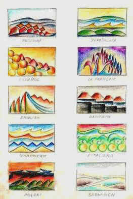 In the left and right outermost columns there are flags of Indo-European and some other languages. Left column: Caucasean, Romance, Celtic, Germanic, Baltic, Slavic, New-Slavic. Right column: Korean, Japanese, Indo-Aryan, Iranian, Armenian, Albanian, Greek. The other smaller flags represents the images of united countries according the principles of language alliance and historical equity.