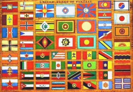 The big flags in the center represent the images of 9 main world language families. From left to right 3 row by 3: Indo-European, Ural, Altaic, Chamito-Semitic, Dravidian, Tibetan-Chinese, Bantuan, Austronesian, Austro-Asian languages.